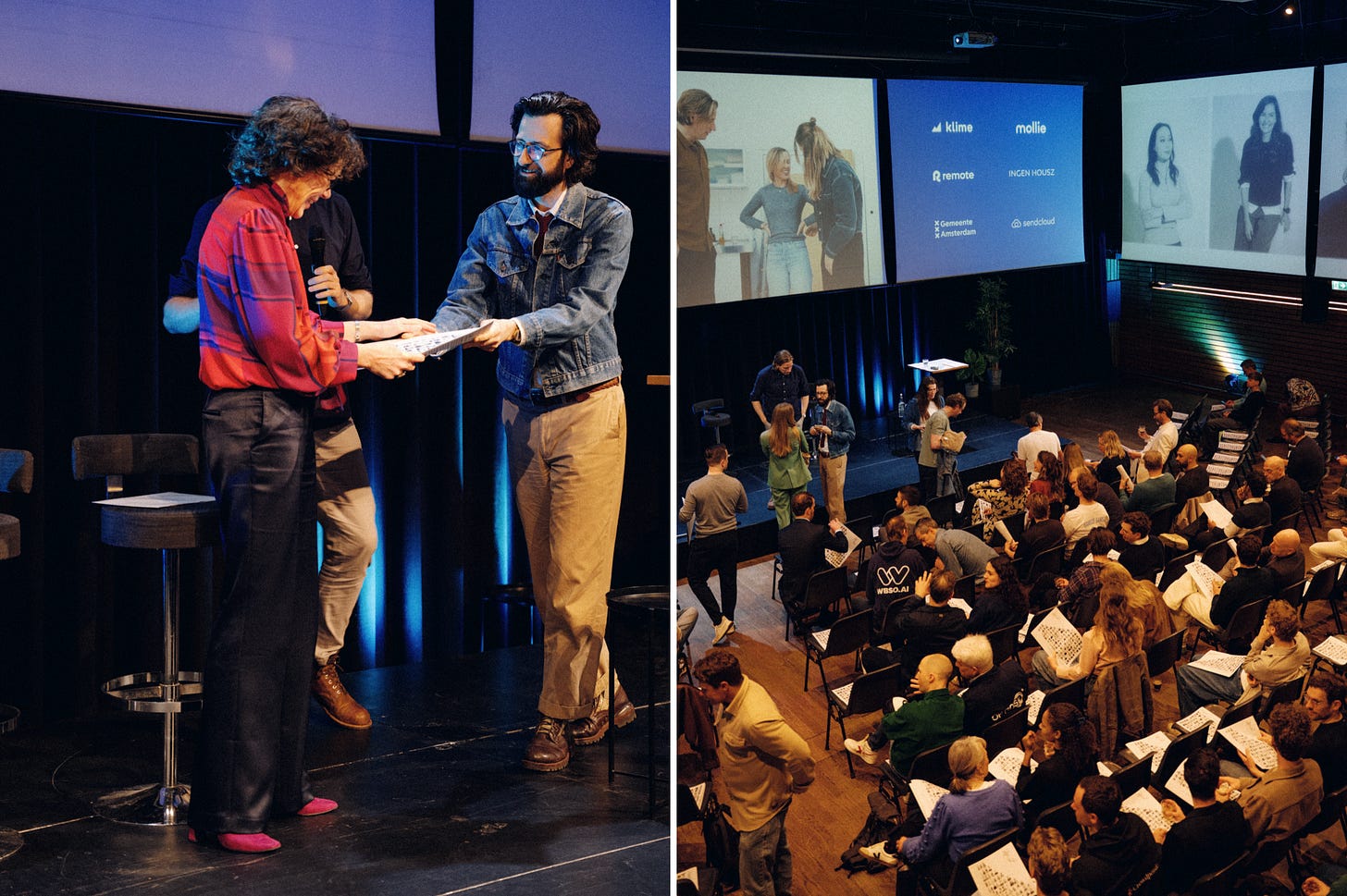 Then we welcomed Heleen Herbert, the Dutch Minister of Economic Affairs and Climate. In the Dutch system, her portfolio covers pretty much the entire world these founders live in: economic policy, entrepreneurship, innovation, and climate. Her job and this community’s work overlap almost perfectly. We presented her with the very first copy of the zine on stage.