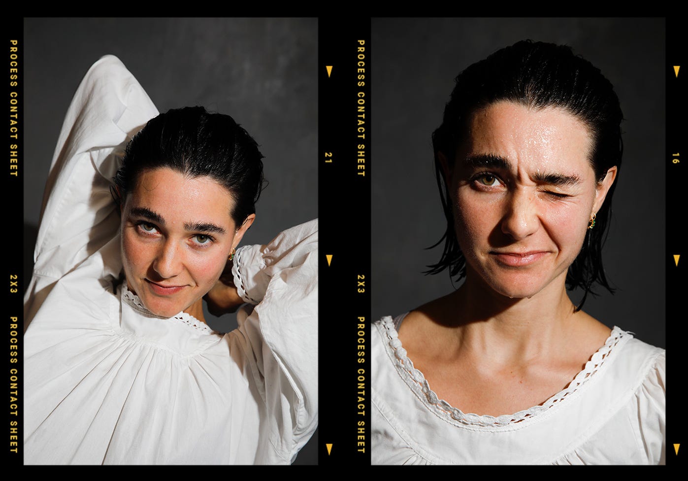 A chance moment, as Lara squeezed water from her hair, yielded an unexpected gem—a shot that unintentionally transformed into a captivating fashion image (see left, below).
